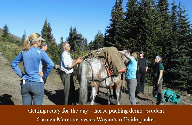 The course was designed for senior university students to take basic outdoor recreation and tourism management skills and theory learned throughout other university courses, and put them into practice; hands-on; experientially. The group included students of all skills levels from those who had never been on a course to those who were experienced riders. They learned how to tack, pack and travel with horses in the backcountry, and much more. Professor Pam Wright, who led the group, reported that they experienced “amazing views from the high alpine, caribou bounding by in a blizzard or sniffing around tents at night, fantastic food, and superb discussions about the M-KMA, conservation planning and management. Outdoor leadership and guiding were highlights between the laughter, good humour and daily adventures of living in the wilderness. By the end of the two weeks most were ready to saddle our horses and join Wayne for the two week trek to the Alaska Highway… but that experience will have to wait for another year.”
